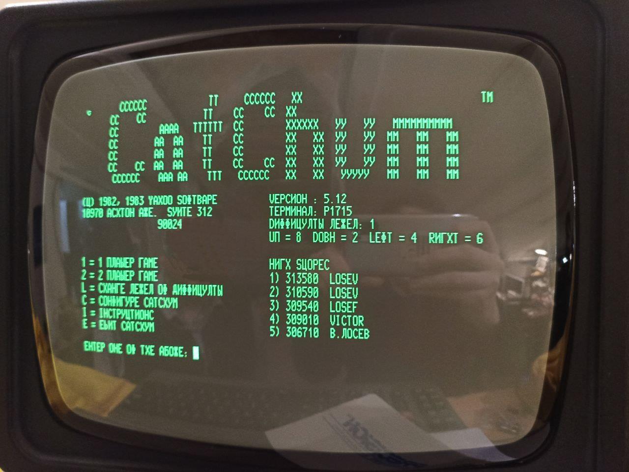 К сожалению, видеоподсистема Robotron 1715M довольно слабая. Сделана она на чипе КР580ВГ75 и поэтому может отображать только 7-битные символы и не может отображать графику. Семи бит не хватает для отображания КОИ8-R и поэтому набор символов небольшой: или латинские большие/маленькие (КОИ7-H0) либо латинские большие и русские большие (КОИ7-Н2) СПЛОШНОЙ КАПСЛОК. Это дает в результате забавные результаты в виде иНЖАЛИД ДЕЖИЦЕ. Подробнее можно прочитать на погибшем Лурке: КОИ-8. Знакогенератор символов программируемый и хакеры теоретитески могли бы даже извлечь из ВГ75 псевдографику или графику “однострочными” битовыми псевдо-символами. Но где же те хакеры ?..